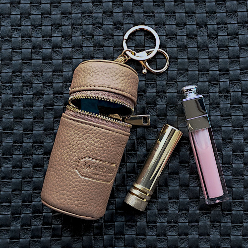 馴染みやすく落ち着いたグレージュのリップケースはかわいい巾着に入れてお届け。